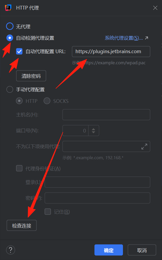 5.选择自动检测代理-勾选上自动代理配置 URL,输入 https://plugins.jetbrains.com,点击检查链接,提示成功的话,重启idea再打开插件市场即可正常下载