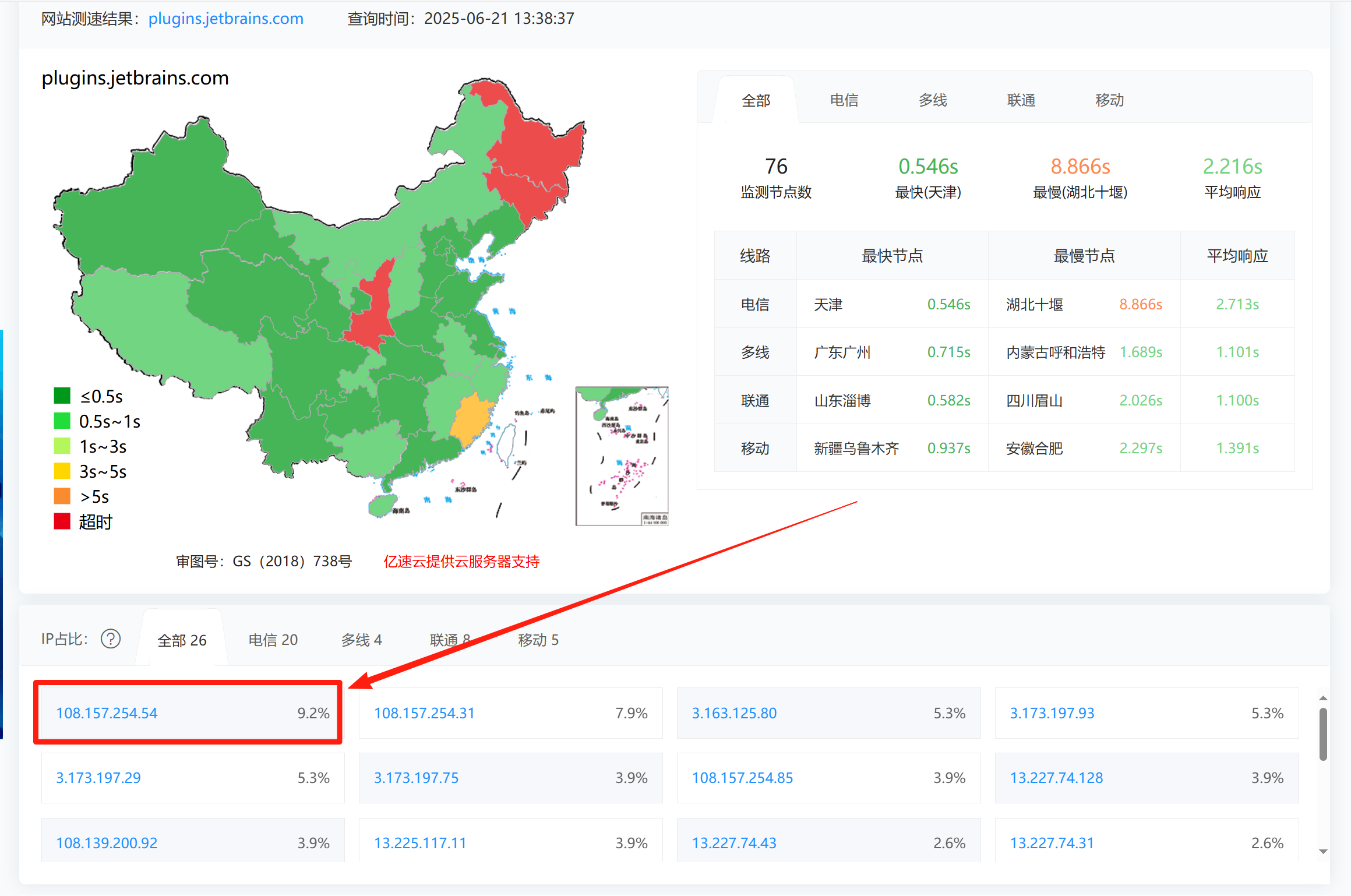 1.点击右侧访问网址https://tool.chinaz.com/speedtest/plugins.jetbrains.com 查看最新解析的ip
