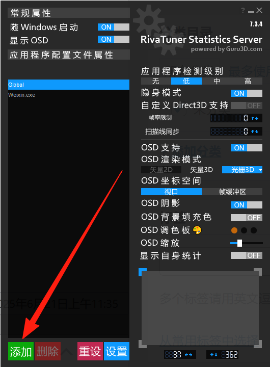 3.选中添加的应用,在右侧关闭OSD支持,这样微信就不会显示参数了