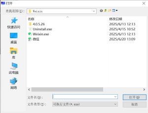2.选择软件安装路径里面的exe文件,我这里用微信举例,点击weixin.exe,点击打开